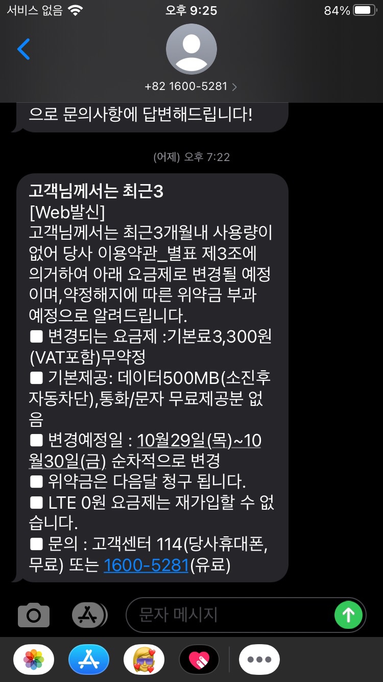 서브 폰으로 아주 약간의 데이터만이 필요했어서 20년 6월 말에 다이소에서 5천원주고 유심을 구매하고 상기에 기술한 요금제를 가입했습니다. 그리고 잘 쓰고 있었는데 20년 10월 28일 저녁 7시경에 뜬금없는 문자가 왔습니다.